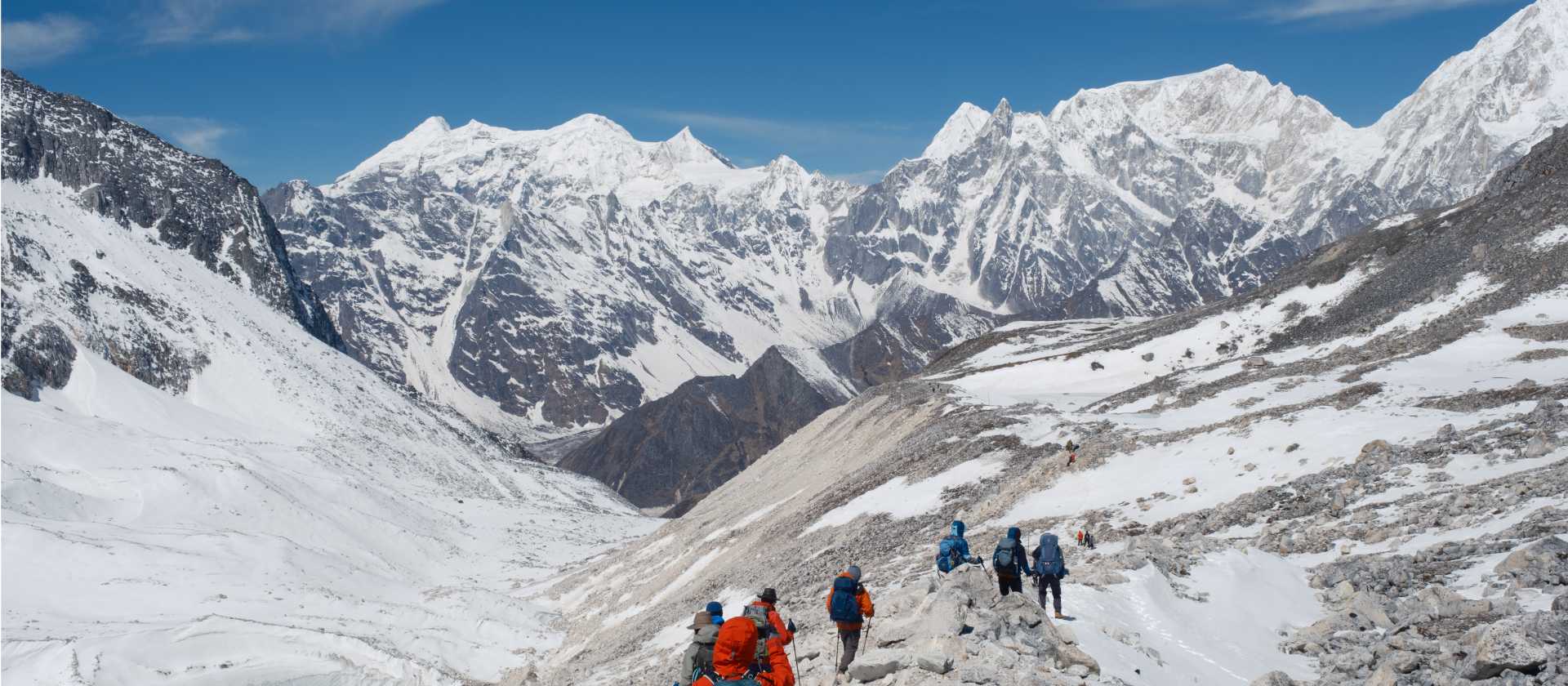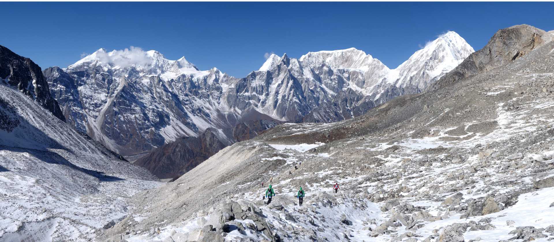 After a couple of stream crossings, the Larkya Glacier appears on the opposite bank. We steadily climb, skirting around the Sarka Khola to camp at a small brick hut at the base of the Larkya La (pass). Overnight: Wilderness camp